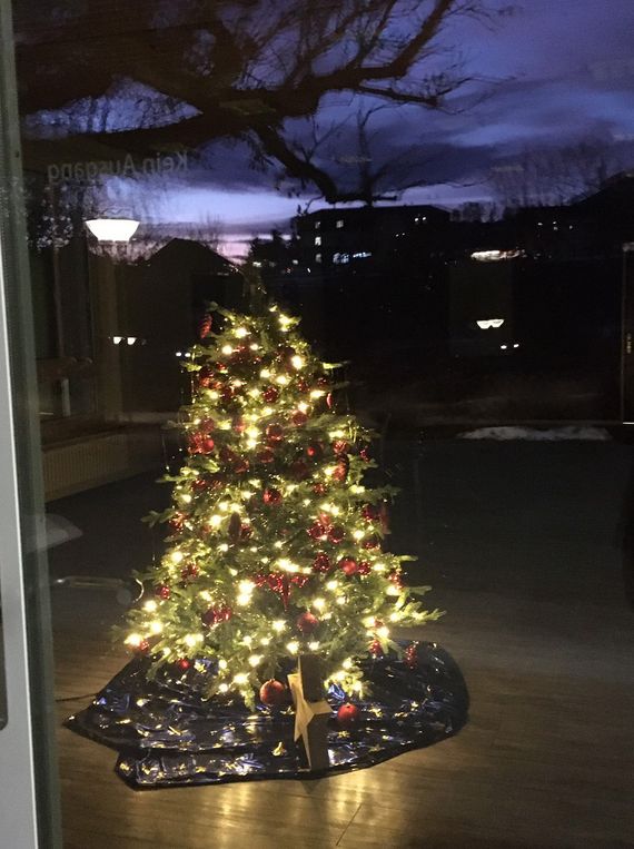 Genauso wie sonst, oder sogar noch üppiger, sorgte der Hauswart mit Weihnachtsbäumen, Lichtern und Dekorationen für weihnachtliche Stimmung. Nach Feierabend ein Blick in die Cafeteria: der wunderschön geschmückte Tannenbaum, umrahmt vom violetten Abendhimmel, der sich in den prächtigsten Farben in der Scheibe spiegelte – Katrin Krause war wie verzaubert und versuchte diese feierliche Abendstimmung zu erfassen.